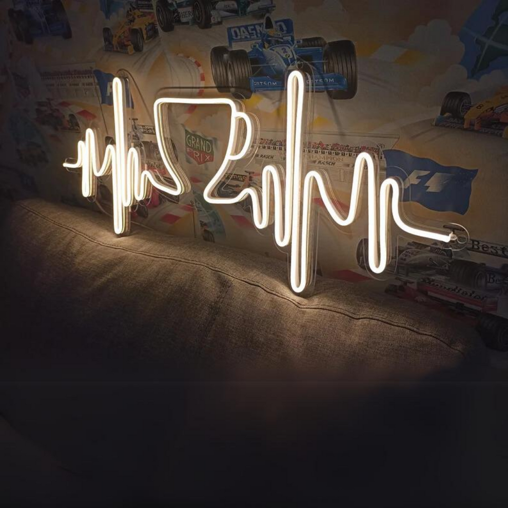 dieses minimalistisch-moderne Neon-Design bringt den Herzschlag jeder Kaffeepause zum Leuchten. Die sanfte, warme Lichtfarbe in Kombination mit dem ikonischen Tassenmotiv und dem stilisierten Herzschlag macht dieses Leuchtschild zur perfekten Ergänzung für Cafés, Co-Working-Spaces oder gemütliche Leseecken.